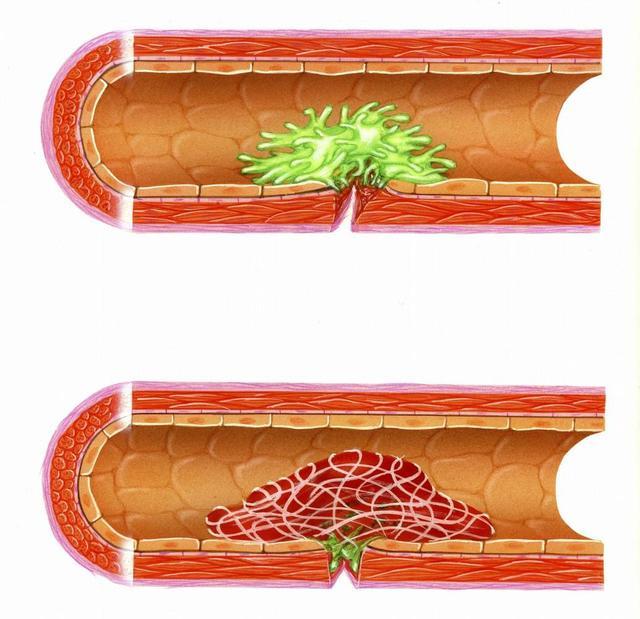 這就形成了血栓的頭部,又稱析出型血栓。血栓體部進一步擴大,並順血流方向延伸,直至血管腔完全被阻塞,血流停滯,血液迅速凝固,形成凝固型血栓。