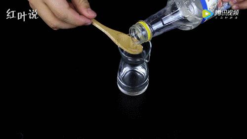 將兩勺洗衣粉倒入杯中,加入四勺白醋,隨後用一根煙攪拌溶液,直至煙頭剩餘的煙絲被溶解進去。