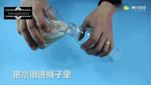 把溶液倒入瓶子裏,加點清水稀釋,同時在瓶蓋上麵戳兩個孔備用。