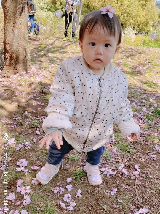 而在另一張照片中,江宏傑兒子頭頂櫻花,手上還拿著櫻花,眼神看起來相當專註,一副萌萌噠的表情,實在是太有愛了。