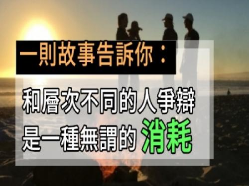 卡耐基說過一句意味深長的話:「在爭論中獲勝的唯一方式,就是避免爭論。」生活中,人與人之間的相處難免會有意見相左的時候,這時候就會產生矛盾,進而發生爭吵,然而井蛙不可語海,兩人的層次若是落差太大,那彼此做再多的溝通也沒有用,層次不同,花再大的力氣也無法達成共識,非但無法解決矛盾,反而會將情況進一步的激化!