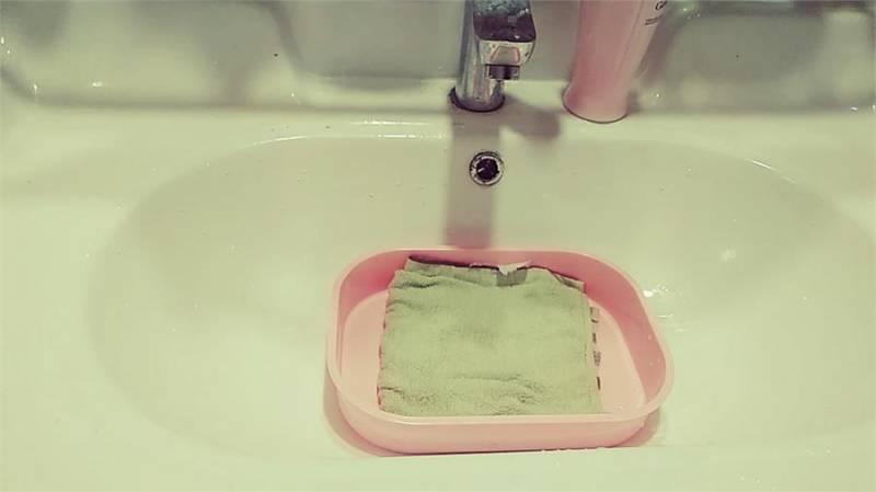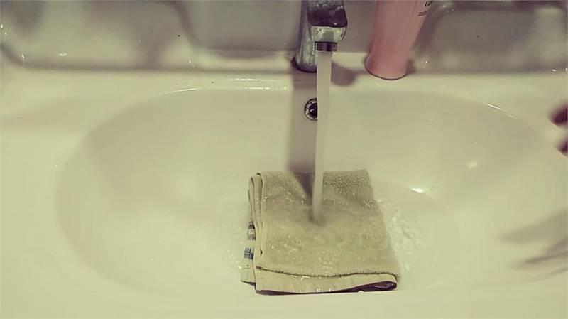 首先拿一條新毛巾,放在水池裡麵浸濕,