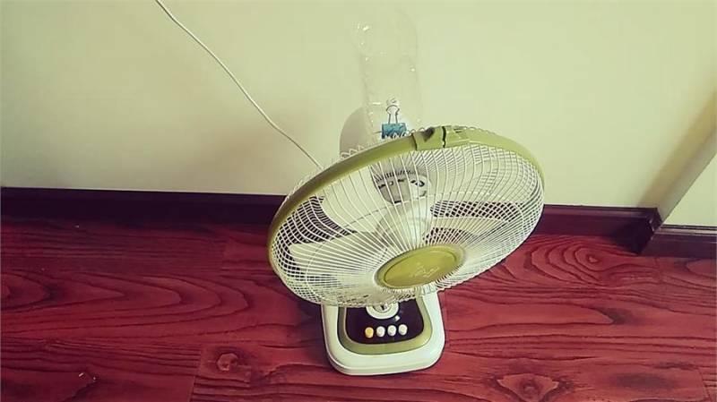 再拿個燕尾夾,夾在電風扇後麵提手的位置固定,
