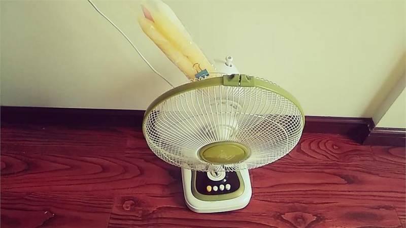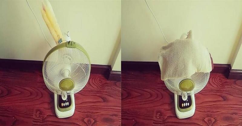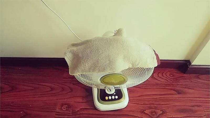20分鐘過後取出,將毛巾折疊直接覆蓋在電風扇的上麵,這樣吹出的風,很涼快,可以讓室內快速降溫,