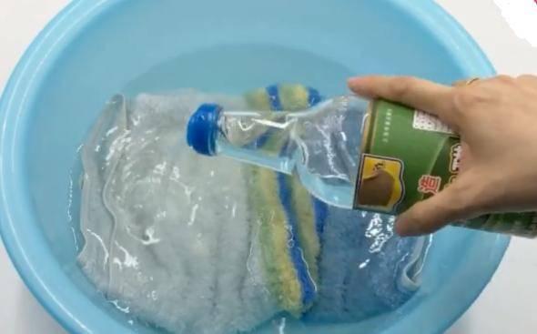 然後用毛巾在盆裡攪拌一下,使白醋花露水和清水攪拌均勻,攪拌好後將毛巾擰一擰(註:不要擰太乾)