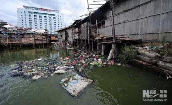 魚塘周圍被雞圈和豬圈環繞,塘中漂浮著大量垃圾,惡臭撲鼻。