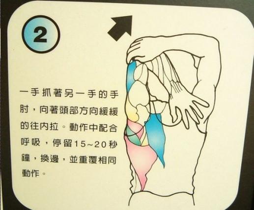 兩手放在背後互抓然後徐徐的將手臂往上,抬高到舒適的部位,然後保持這種姿勢。