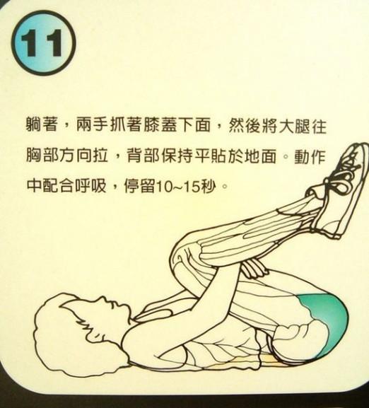 仰臥抓著膝蓋後麵,然後緩緩的將腿拉向胸部,保持腿部的伸直,而另一腳保持彎曲。動作中配合呼吸,停留10秒鐘,換邊,並重覆相同動作。