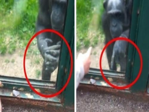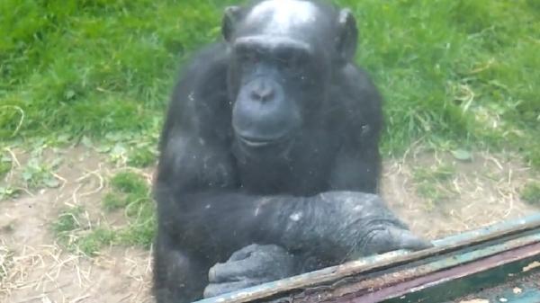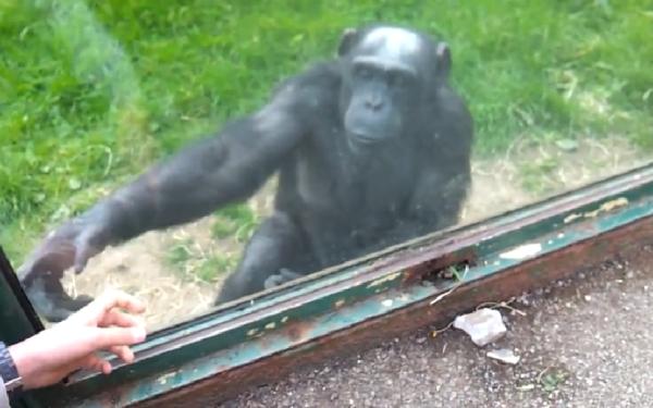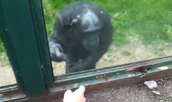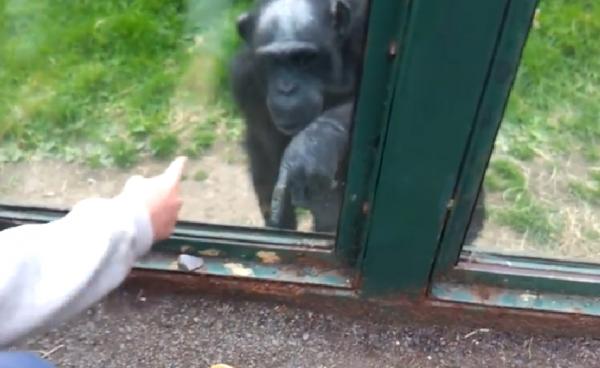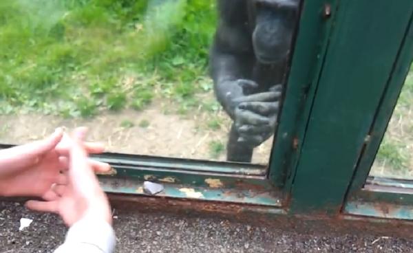 觀察到一隻黑猩猩一直隔著玻璃比著奇怪的手語,