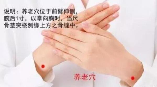 第一種:以指揉法為主,用手指腹吸定在養老穴上,手腕放鬆,做柔和而有滲透力的擺動,每日1~2次,每次約10分鐘即可,手法宜輕,不可以過強刺激。