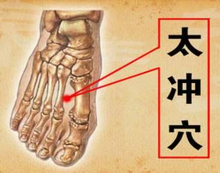 這是指太沖穴,位置在足背第一、二蹠骨結合部之前的凹陷中。