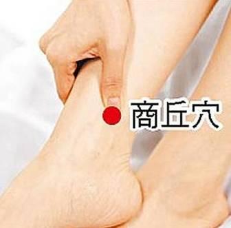這是指商丘穴,位置在內踝前下方的凹陷中,