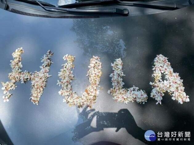 雪白的油桐花盛開,遊客用花瓣排字留念。(圖/呼啦莊園提供)