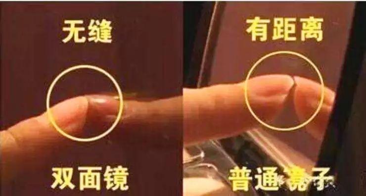 還有一個方法就是,拿自己隨身攜帶的小鏡子辨別。將小鏡子貼到該鏡子上對比一下成像的亮度,照自己的臉或者同一個物體,如果大鏡子成像亮度明顯低於小鏡子,那麼你可能已經暴露了。