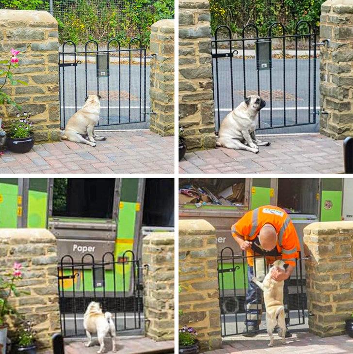13.「這是沃爾特,沃爾特每個星期一都會在前門等他的朋友-垃圾車叔叔,因為他們總是用愛和笑容對待牠!」