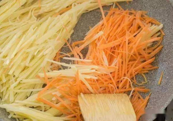 2.熱鍋少油,倒入土豆絲和胡蘿卜絲翻炒。中火翻炒約3分鐘後,調入鹽。