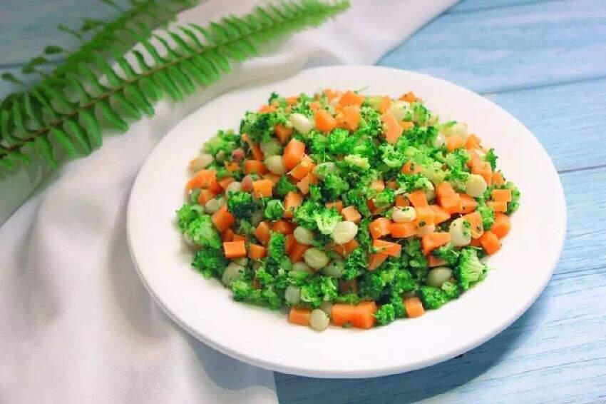 2.起鍋燒水,放入一丁點鹽,分別將西蘭花、玉米粒、紅薯焯水備用