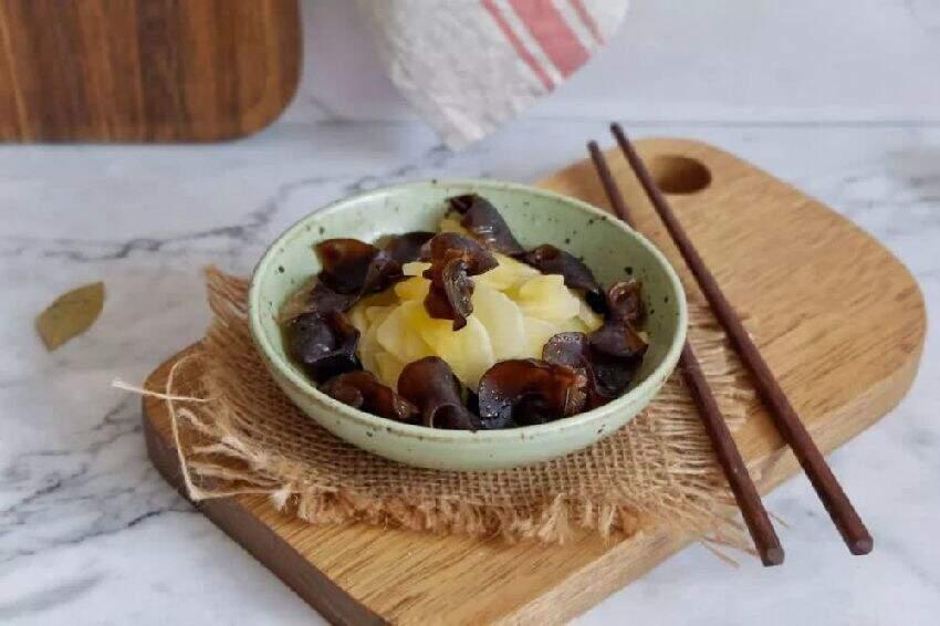 2.雪蓮果去皮切成片,浸泡在白醋水中備用,木耳撕成小塊,生薑切片。