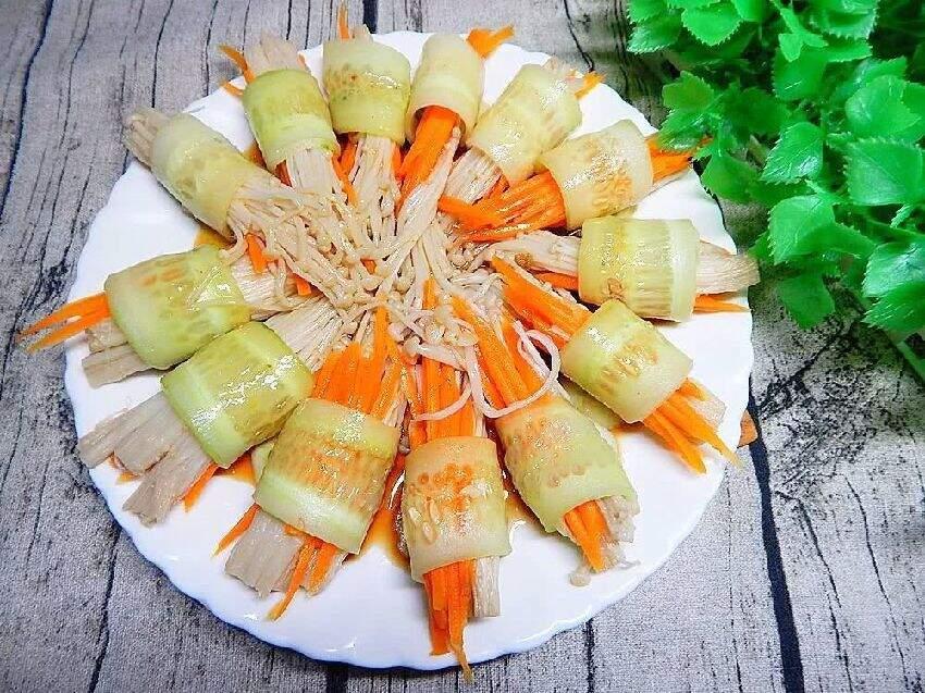 6.一根黃瓜片加入燙好的金針菇,在加胡蘿蔔條全部捲起來。