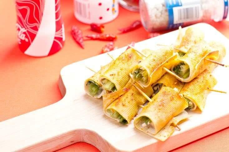 2.成形:將芹菜、金針菇平均分成18份;將豆腐皮鋪平,每片放入一份芹菜、金針菇,將豆腐皮卷緊;用兩根牙籤分別固定住上麵和下麵;將豆腐卷用刀從中間一切為二備用。