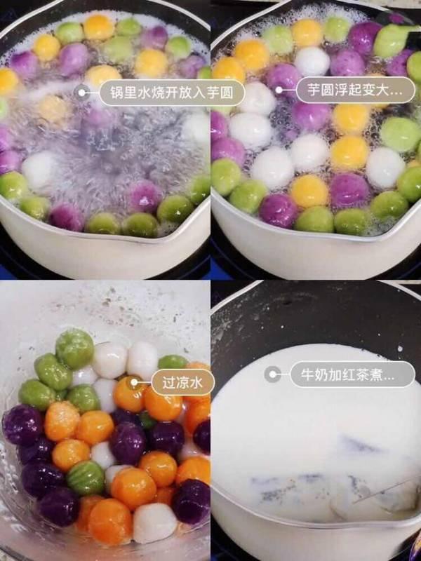️300ml牛奶加入3g紅茶包小火煮3分鐘,過濾出奶茶備用,鍋裡水燒開,放入芋圓煮熟撈出過涼白開水,最後倒入奶茶即可!
