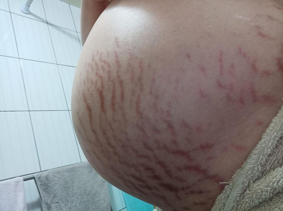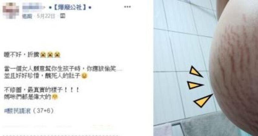 原PO在臉書「爆廢公社」貼出一張照片,照片中可見,她大大的孕肚上,出現一條條清晰可見的紅色紋路,宛如紅色毛毛蟲爬上她的肚皮一般。