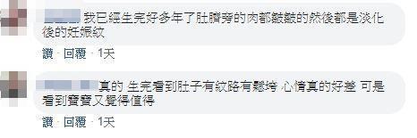 照片一出,立刻引起熱烈迴響,網友們忍不住讚嘆當媽媽的辛勞,紛紛表示「 只有當媽媽的才知道懷孕和生產的辛苦」、「一點都不會難看跟醜,這是一個偉大又驕傲的印記。加油,各位媽媽們真棒」、「我老婆也是這樣,但我覺得她的肚子很美,每天都親她肚子」、「世上最美的印記,加油辛苦了」、「 我只覺得那是美麗又偉大的痕跡」。