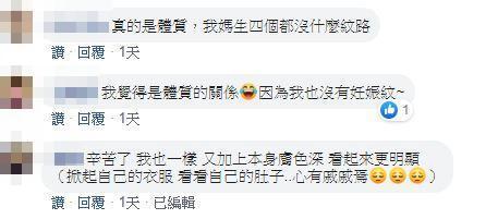 這篇貼文也釣出一票媽媽, 分享起自己與妊娠紋的「愛恨糾葛」,「我的肚子也是這樣呢」、「擦的速度永遠趕不上滋長的速度,所以我也放棄了」、「我也是三個月就開始擦,完全無效還是爬滿肚子。我媽媽也是這樣。所以是遺傳體質吧」、「生完看到肚子有紋路有鬆垮,心情真的好差,可是看到寶寶又覺得值得」 。