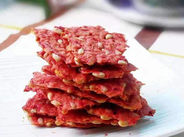 材 料:甜菜根1隻,白醋若幹,鹽少許,辣椒醬少許步 驟:1、甜菜根去皮,切絲入大碗。2、白醋淹沒整個甜菜根,加鹽和辣椒醬。3、放冰箱2-3天後即可食用。6 甜菜根瓜子薄脆