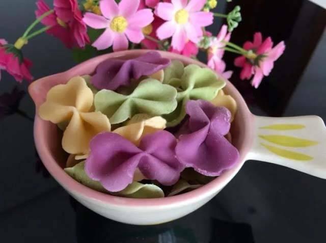 材 料:甜菜根適量,麵粉140g步 驟:1、甜菜根去皮切塊,放入容器,用料理棒打成泥。2、甜菜根泥過濾出汁,取汁60g,麵粉140g,汁分次倒入麵粉攪拌成絮狀揉成麵糰。3、將麵糰趕壓成麵片,用模具按壓出形狀。4、用筷子把花型上下一夾,蝴蝶麵就玩成啦。5、可以改成其他果蔬打汁,不同顏色不同形狀的麵條,又有營養又好看。8 杏仁甜菜根補血意麵