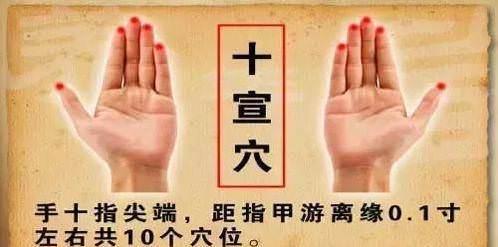 十宣(在十指尖端,去爪甲一分,雙手共10穴)。兩手交換,一手母食指岔開,一指一指挨著捏壓兩側,10指共捏2—3分鐘。