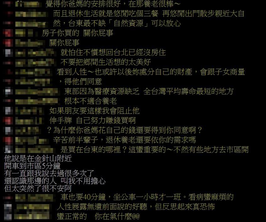 文章公開後,立刻就吸引許多網友激烈的討論,有一派網友認為,原PO的擔憂合情合理,「如果我爸媽突然搬到離島之類的,我也會希望先討論一下啊,臨時要看醫生什麼的怎麼辦?」、「你爸媽有先試住過嗎?天氣熱再加上風沙...」;至於另一方則認為應該以老人家的想法為主,「辛苦一輩子想去清閒的地方,要經過你同意?」、「如果兩老身體還健康,去花東住有什麼好擔憂的」。