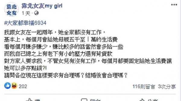 該名苦情男子在臉書粉絲專頁「靠北女友」透露,