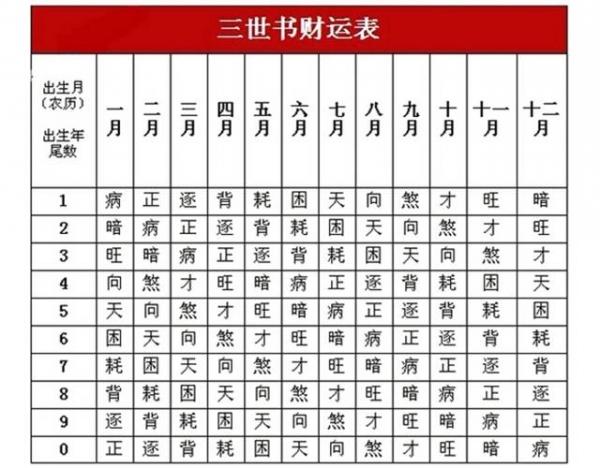 根據以下《三世書》的財運表對照查閱所屬財運。