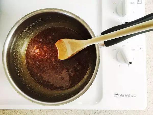 3.在鍋中加入黃油、糖漿和清水,小火加入煮化。再加入小蘇打。然後冷卻。