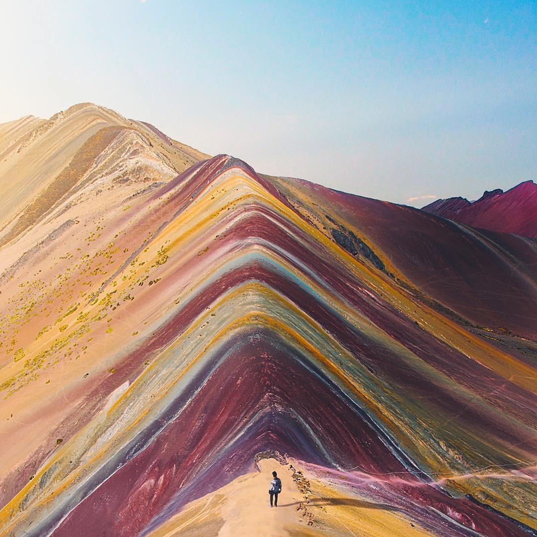 彩虹山(Vinicunca)坐落於秘魯庫斯科(Cuzco),是安第斯山脈(Andes)的其中一段,整座山的表麵覆蓋著一層層不同色彩的土壤,繽紛的岩層條理分明,是非常典型的「丹霞地貌」。