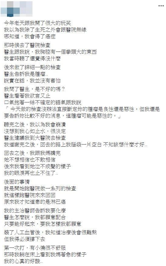 原PO說,她當時腦袋空白,回家後立刻告訴媽媽,「她不想相信也不敢相信,後來我看到她泣不成聲的樣子,我的眼淚再也止不住了」,接著到醫院進行檢查,才知道自己確診淋巴癌。