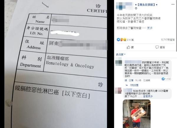 「我的閨蜜20年前,年紀輕輕也罹患淋巴癌,當時以為她被判了死刑,好難過,但不知不覺20年過去了,她現在跟一條牛一樣健壯,工作如常,所以要保有一顆樂觀開朗的心,相信妳會熬過去的」、
