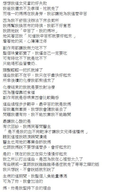 原PO表示,某次她回診時,媽媽哭著問醫師「 是不是我的血不夠乾淨才讓我女兒得這種病 」,頓時讓她眼淚潰堤,好在醫師用專業解釋、安慰,才讓她們母女倆堅持走過去,「生病的這期間,我整個人負能量爆滿,可為了妳,我會加油的」