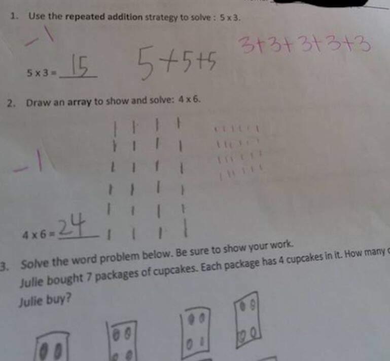 第一題要求學生使用重復加法表示5×3,學生的答案是5+5+5=15,老師批錯,正確答案是 3 + 3 + 3 + 3 + 3 = 15
