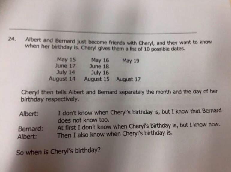 新加坡的一位主持人首次將這道小學5年級的邏輯題發布到Facebook上,被轉發了近6000次。這道題的問題是Cheryl的生日是哪一天?題中,Cheryl告訴 Albert和Bernard不同的線索,一人只知道日期,另一人只知道月份,根據2人的對話最後找出Cheryl的生日。最終的答案是7月16日。之後被發現這道題並不是新加坡普通小學生做的題目,而是新加坡和亞洲學校數學奧林匹克比賽(SASMO)中的一道奧數題。