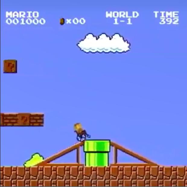 畫面一開始這個身障馬力歐因為輪椅的關係,沒有辦法跳上水管,卡關啜泣哈哈哈