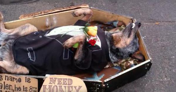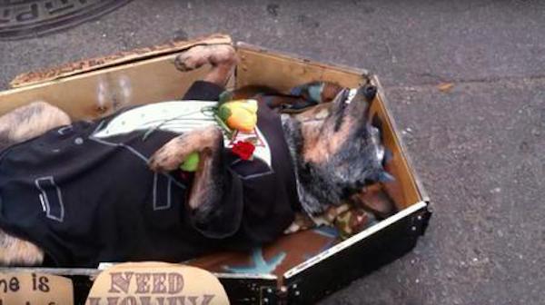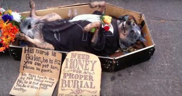 狗狗可憐的樣子最容易賺到我們的眼淚,在美國紐奧良的街頭就有一隻汪汪超級厲害,精湛的演技根本可以拿到奧斯卡!這隻狗狗的名字叫做Galen,牠躺在棺材裡面,一動也不動,旁邊的版子上寫著,需要「籌措喪葬費」。