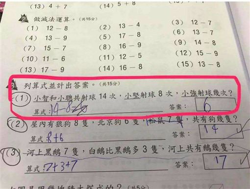 日前網友在「爆料公社」中PO了一張數學考卷,並提問「大家知道答案嗎?」,只見題目中表示「小智和小聰共射球14次,小堅射球8次,小強射球幾次?」