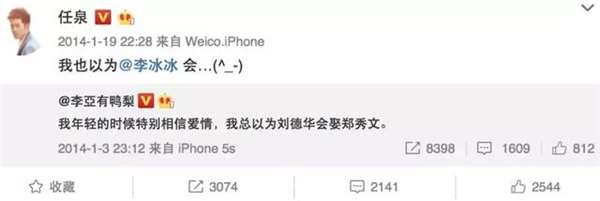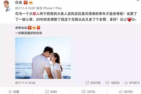 2月27日零點,任泉在微博「表白」李冰冰:不管什麼時候,我都會一直陪在你身邊。
