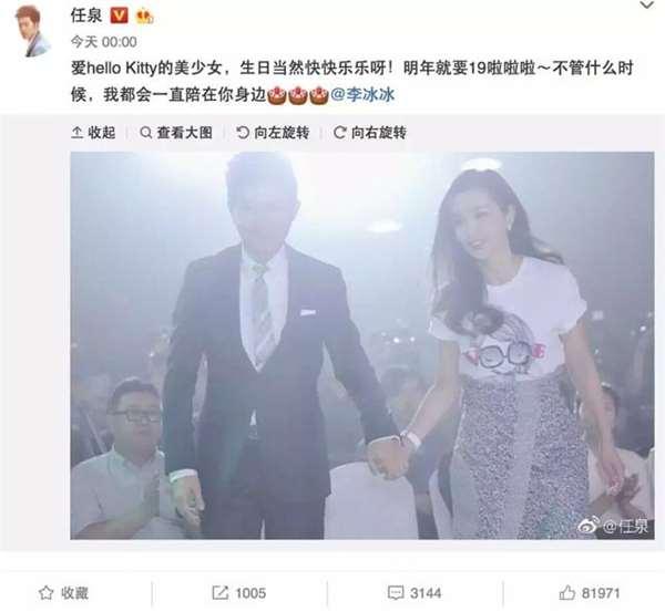 李冰冰每年的生日,任泉都會風雨無阻地送上祝福,今年也不例外。