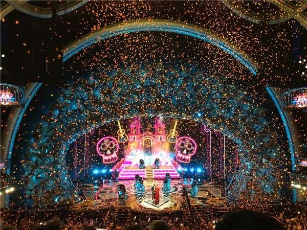 整個頒獎禮,最感動的瞬間,就是《Remember me 》在舞台上唱起,一曲畢,天空灑下數以千萬記的橙色萬壽菊。