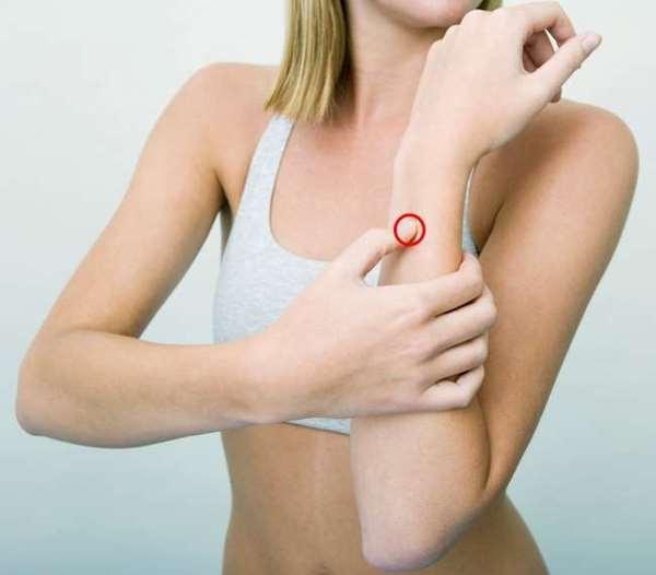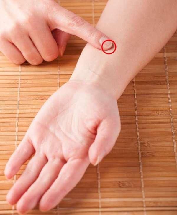 位於手腕橫紋正中,沿著兩條筋的中間往上2寸處。按摩這個穴位能夠減緩噁心、嘔吐、暈車。