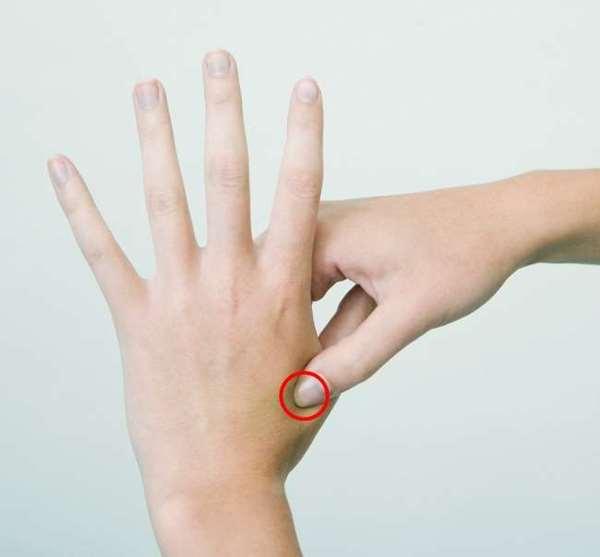 位於大姆指食指相會合之處。按摩這個穴位能夠緩解牙痛、肩頸疼痛、頭痛。