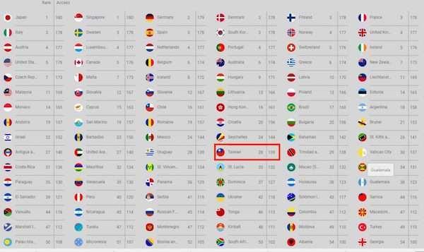 而台灣目前有有139個免證國家,因為較去年多了5個免簽證國家,所以名次從31名攀上28名,屬前段班國家,而中國的免簽證國雖然成長快速,還是以64個國家與烏干達並列74名。